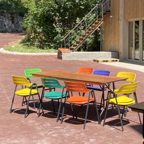 Les canoës et autres gisements de plastiques sont sourcés dans un rayon de 100km, et sont également transformés dans la Drôme… pour devenir cette chaise très pratique. Elle s’empile à la verticale tant que la longueur de vos bras le permet . Côté confort, la souplesse du dossier, liée au matériau d’origine, est très appréciable ; et l’angulation assise dossier, savamment étudiée, promet une posture agréable pour longtemps ! Et évidemment, elle est complètement démontable et recyclable.